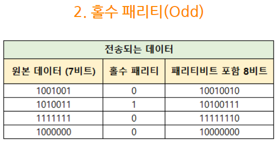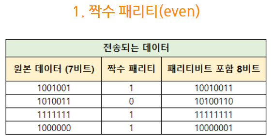 - 패리티 비트는 짝수, 홀수 두 가지 방법이 있음