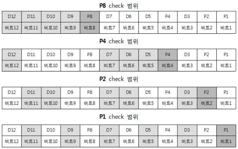 - 수신된 데이터로 다시 1 ~ 3 작업을 수행하여 패리티 비트를 계산하여 수신된 체크 비트열과 비교하여 오류 검출 가능